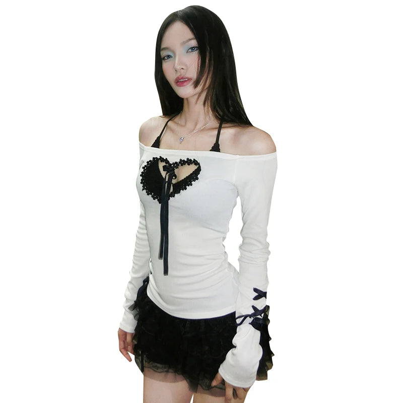 Dare to be unforgettable in Blackkiss, a sultry Y2K-inspired top that blends sweet romance with edgy allure. Designed with an off-shoulder neckline, dramatic heart-shaped cutout, and delicate lace trim, this stretchy knit piece hugs your curves in all the right places. Finished with long sleeves adorned with black satin ribbon bows, it's the ultimate statement for hipster babes and coquette queens alike. Pair it with a mini skirt or flared pants for an iconic streetwear look.
