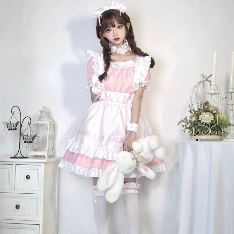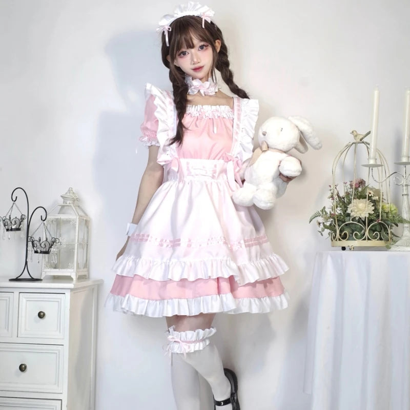 Introducing Callie, the epitome of Japanese Gothic charm in a Sissy Maid Dress Sweet School Girl set. Crafted from high-quality polyester, this captivating ensemble features intricate lace-up details on the dress, complemented by coordinating headwear, apron, necklace, leg ring, and wristband.