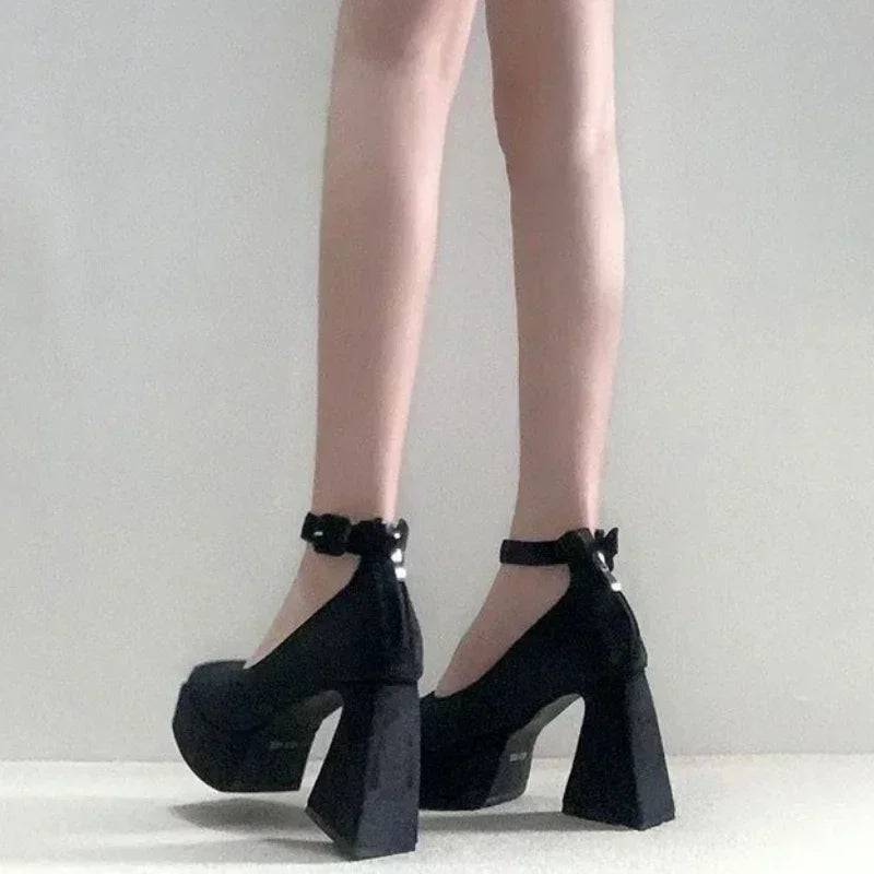 Step into the spotlight with Domidolly, a pair of gothic-chic platform heels that blend innocence with edge. Featuring a square toe, chunky square heel, and slip-on ease, these shoes are perfect for dollcore, coquette, and alt fashion lovers alike. Style with lace socks, miniskirts, or oversized knits for a statement look that stomps softly but makes noise.