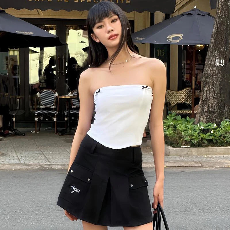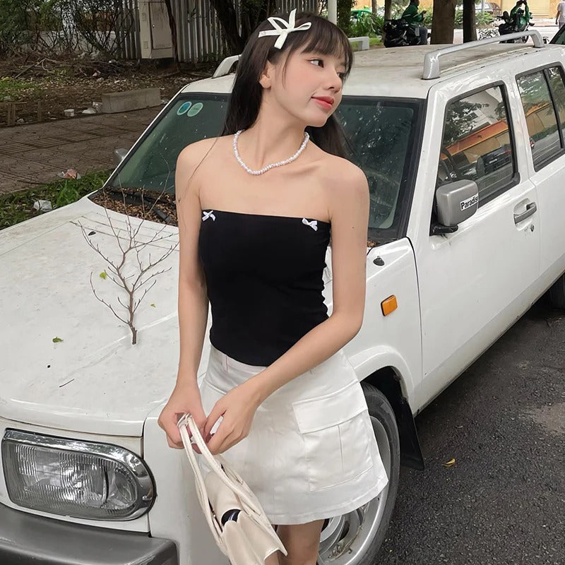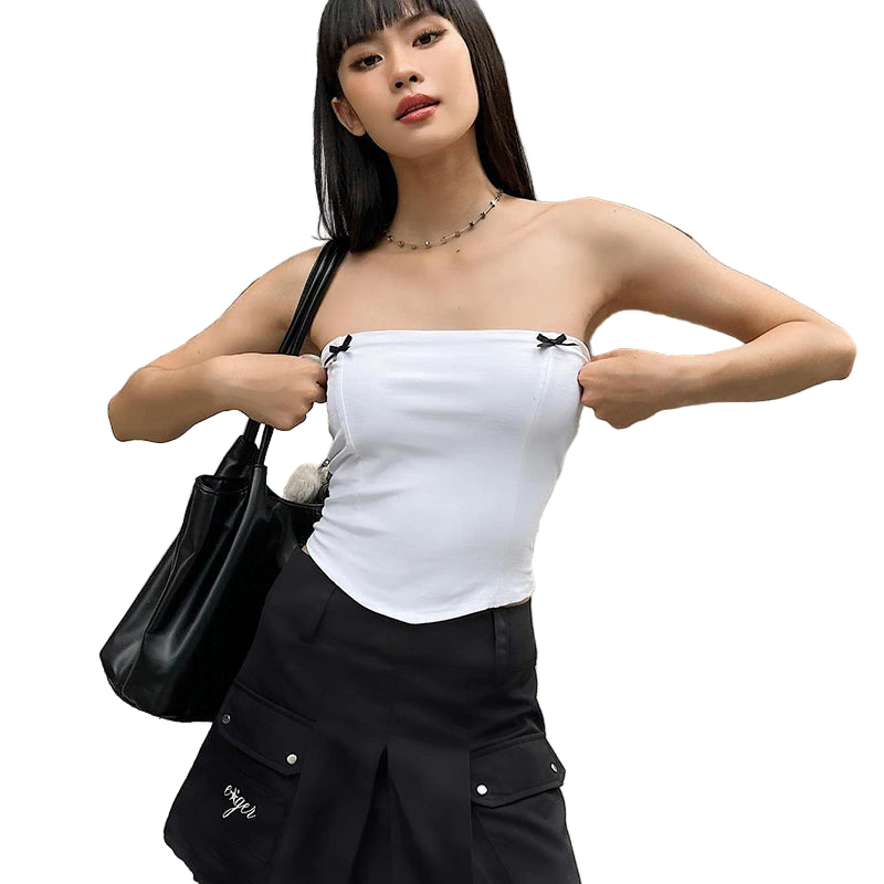 Turn heads this summer with the HottieBow Top the ultimate blend of flirty and sleek. Featuring a strapless, figure-hugging silhouette with delicate black bow accents, this cropped tank top is designed to highlight your shape while adding a touch of playful charm. The soft, stretchy knit fabric ensures comfort and flexibility, perfect for day-to-night streetwear or sultry summer outings. Style it with wide-leg pants, mini skirts, or low-rise jeans for a trendy Y2K vibe.