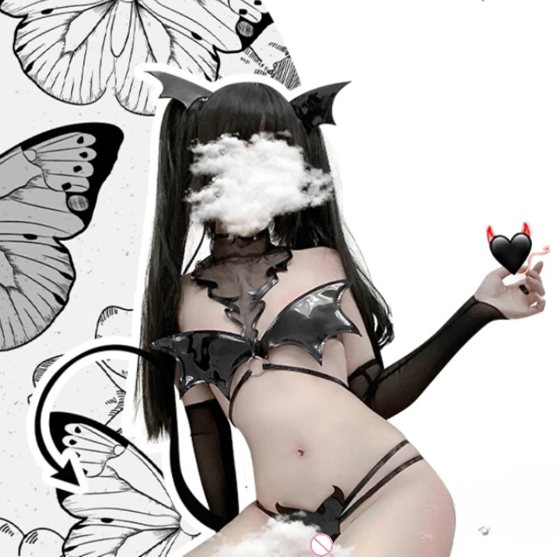 Ignite your wild side with the Inferna lingerie set from KawaiiffyMe. This provocative five-piece ensemble features a daring hollow-out design, PU leather, devil wings, and a seductive T-back. Ideal for Halloween, nightclub wear, or demon role play, Inferna brings fierce, seductive energy to your look.