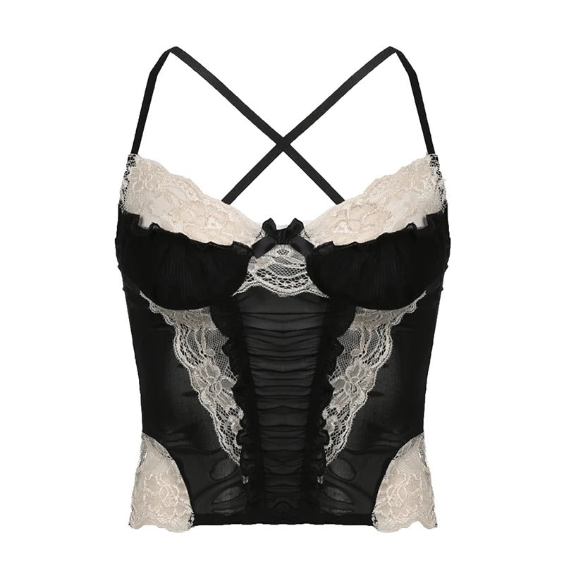 Flirty, feminine, and effortlessly chic Lacerella is the ultimate blend of vintage romance and Y2K glam. With delicate lace splicing, soft ruffle details, and a dainty bow, this dreamy crop top adds the perfect touch of elegance to your look. The semi-sheer mesh and figure-hugging stretch fabric make it both sultry and comfortable, ideal for summer days and nights.