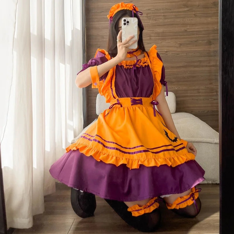 Get ready for enchanting cosplay with the Lilac set. This adorable six-piece outfit includes a charming purple maid dress, apron, headwear, sleeve covers, collar, and leg rings, making it perfect for Halloween, anime parties, or Lolita-inspired events. Designed for sizes S to 5XL, Lilac offers both elegance and comfort with bow accents and soft polyester fabric.