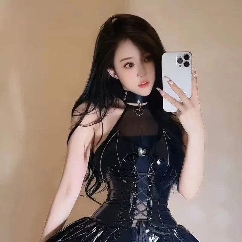 Turn heads with the NoirDemon costume. This bold three-piece set features a sleek black latex-style dress, a mesh see-through design, and gothic-inspired necklace. Perfect for Halloween or stage performances, it offers a flattering fit and striking devilish style.