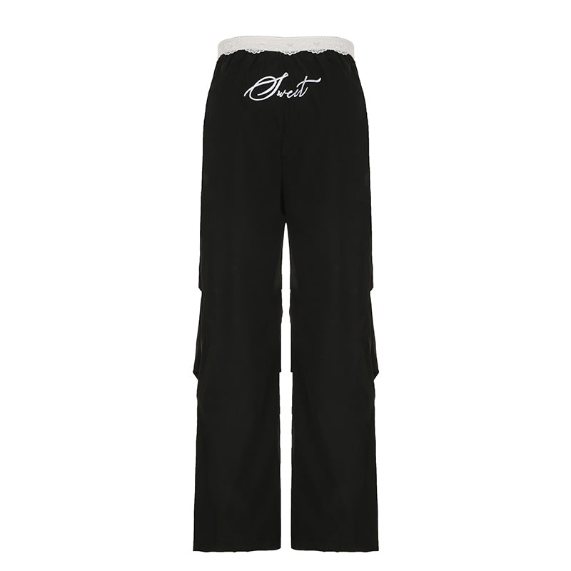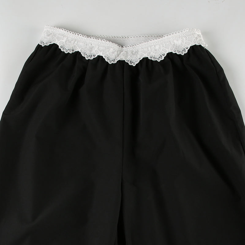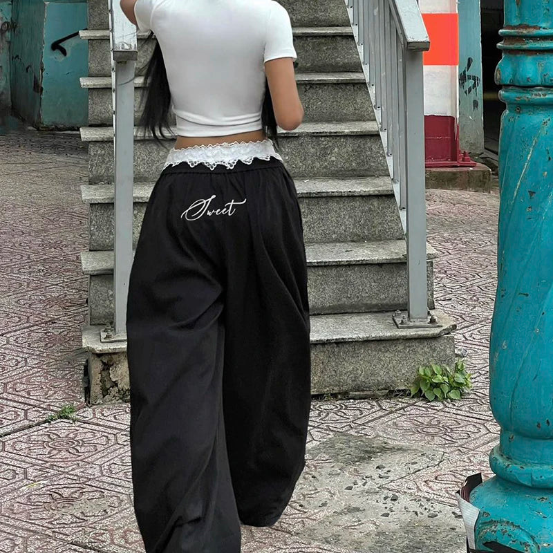 Elevate your streetwear game with these wide-leg lace-trim pants. Designed for all seasons, these pants offer a perfect blend of comfort and style with their loose fit and slight stretch fabric. Made from a high-quality polyester and spandex blend, they feature a flattering mid-rise waist with an elastic closure for effortless wear. The delicate lace detail adds a touch of femininity to the solid, versatile design. Whether you're heading out for a casual day or looking to make a chic statement, these pants are your go-to for modern elegance with a streetwear edge.